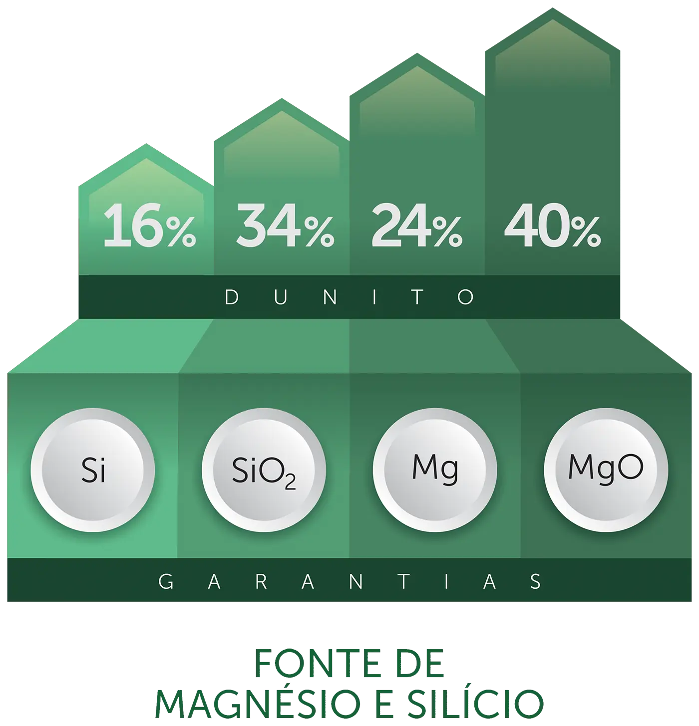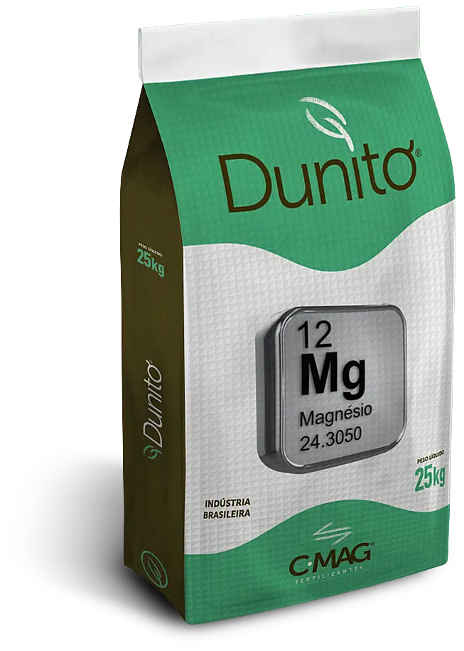O Dunito® é um fertilizante mineral simples, registrado no MAPA, com solubilidade controlada que garante fornecimento contínuo de magnésio (Mg) ao longo do ciclo da cultura e disponibiliza silício (Si), elemento benéfico ao desenvolvimento das plantas.